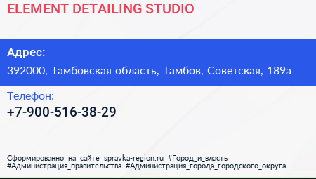ELEMENT DETAILING STUDIO по адресу 392000, Тамбовская область, Тамбов, Советская, 189а в дальнейшем Организация, размещена в следующих категориях: