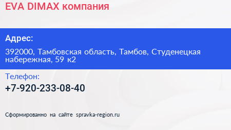 EVA DIMAX, компания по адресу 392000, Тамбовская область, Тамбов, Студенецкая набережная, 59 к2 в дальнейшем Организация, размещена в следующих категориях: