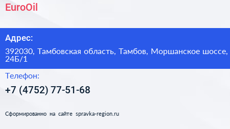 EuroOil по адресу 392030, Тамбовская область, Тамбов, Моршанское шоссе, 24Б/1 в дальнейшем Организация, размещена в следующих категориях:
