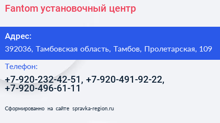 Fantom, установочный центр по адресу 392036, Тамбовская область, Тамбов, Пролетарская, 109 в дальнейшем Организация, размещена в следующих категориях:
