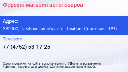 Форсаж, магазин автотоваров по адресу 392000, Тамбовская область, Тамбов, Советская, 191г в дальнейшем Организация, размещена в следующих категориях: