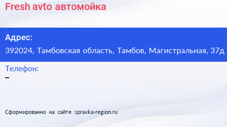 Fresh avto, автомойка по адресу 392024, Тамбовская область, Тамбов, Магистральная, 37д в дальнейшем Организация, размещена в следующих категориях:
