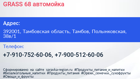 GRASS 68, автомойка по адресу 392001, Тамбовская область, Тамбов, Полынковская, 38в/1 в дальнейшем Организация, размещена в следующих категориях: