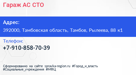 Гараж АС, СТО по адресу 392000, Тамбовская область, Тамбов, Рылеева, 88 к1 в дальнейшем Организация, размещена в следующих категориях: