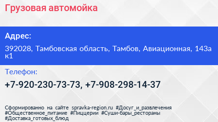 Грузовая автомойка по адресу 392028, Тамбовская область, Тамбов, Авиационная, 143а к1 в дальнейшем Организация, размещена в следующих категориях: