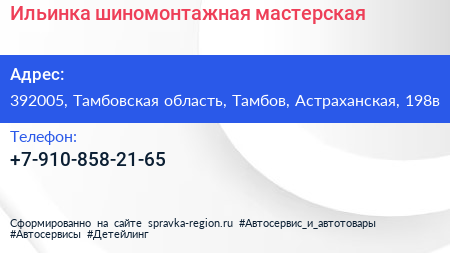 Ильинка, шиномонтажная мастерская по адресу 392005, Тамбовская область, Тамбов, Астраханская, 198в в дальнейшем Организация, размещена в следующих категориях: