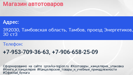 Магазин автотоваров по адресу 392030, Тамбовская область, Тамбов, проезд Энергетиков, 30 ст3 в дальнейшем Организация, размещена в следующих категориях: