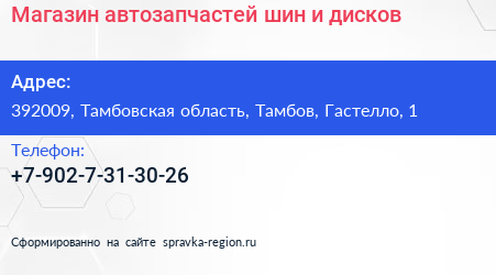 Магазин автозапчастей, шин и дисков по адресу 392009, Тамбовская область, Тамбов, Гастелло, 1 в дальнейшем Организация, размещена в следующих категориях: