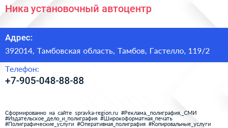 Ника, установочный автоцентр по адресу 392014, Тамбовская область, Тамбов, Гастелло, 119/2 в дальнейшем Организация, размещена в следующих категориях: