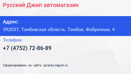 Русский Джип, автомагазин по адресу 392037, Тамбовская область, Тамбов, Фабричная, 4 в дальнейшем Организация, размещена в следующих категориях: