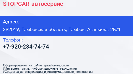 STOPCAR, автосервис по адресу 392019, Тамбовская область, Тамбов, Агапкина, 2Б/1 в дальнейшем Организация, размещена в следующих категориях: