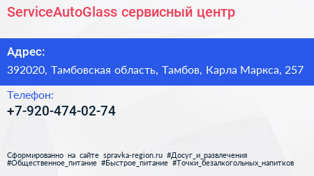 ServiceAutoGlass, сервисный центр по адресу 392020, Тамбовская область, Тамбов, Карла Маркса, 257 в дальнейшем Организация, размещена в следующих категориях: