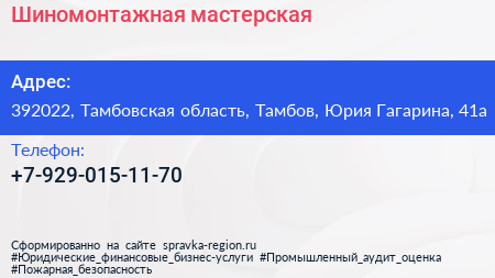 Шиномонтажная мастерская по адресу 392022, Тамбовская область, Тамбов, Юрия Гагарина, 41а в дальнейшем Организация, размещена в следующих категориях: