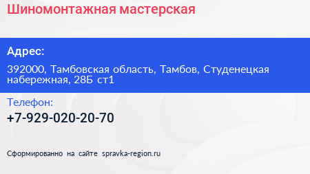 Шиномонтажная мастерская по адресу 392000, Тамбовская область, Тамбов, Студенецкая набережная, 28Б ст1 в дальнейшем Организация, размещена в следующих категориях: