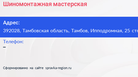 Шиномонтажная мастерская по адресу 392028, Тамбовская область, Тамбов, Ипподромная, 25 ст6 в дальнейшем Организация, размещена в следующих категориях:
