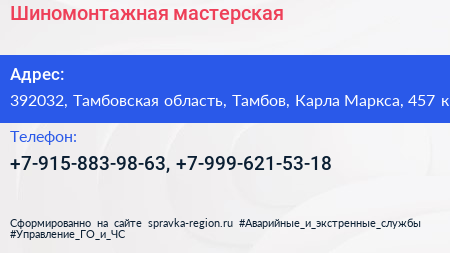 Шиномонтажная мастерская по адресу 392032, Тамбовская область, Тамбов, Карла Маркса, 457 к1 в дальнейшем Организация, размещена в следующих категориях: