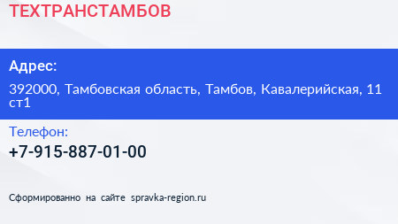 ТЕХТРАНСТАМБОВ по адресу 392000, Тамбовская область, Тамбов, Кавалерийская, 11 ст1 в дальнейшем Организация, размещена в следующих категориях: