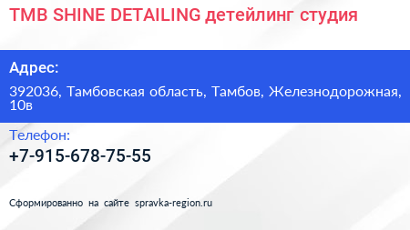 TMB SHINE DETAILING, детейлинг-студия по адресу 392036, Тамбовская область, Тамбов, Железнодорожная, 10в в дальнейшем Организация, размещена в следующих категориях: