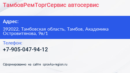 ТамбовРемТоргСервис, автосервис по адресу 392022, Тамбовская область, Тамбов, Академика Островитянова, 9в/1 в дальнейшем Организация, размещена в следующих категориях: