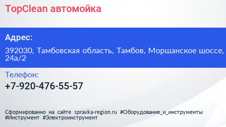 TopClean, автомойка по адресу 392030, Тамбовская область, Тамбов, Моршанское шоссе, 24а/2 в дальнейшем Организация, размещена в следующих категориях: