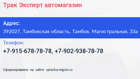 Трак Эксперт, автомагазин по адресу 392027, Тамбовская область, Тамбов, Магистральная, 33а в дальнейшем Организация, размещена в следующих категориях: