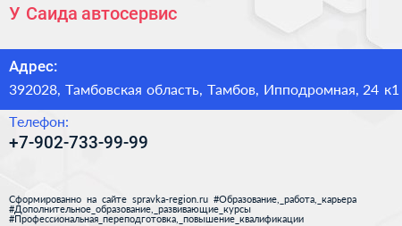У Саида, автосервис по адресу 392028, Тамбовская область, Тамбов, Ипподромная, 24 к1 в дальнейшем Организация, размещена в следующих категориях: