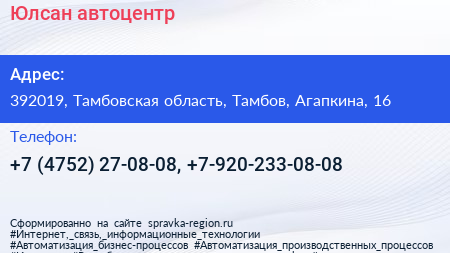 Юлсан, автоцентр по адресу 392019, Тамбовская область, Тамбов, Агапкина, 16 в дальнейшем Организация, размещена в следующих категориях: