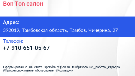 Bon Ton, салон по адресу 392019, Тамбовская область, Тамбов, Чичерина, 27 в дальнейшем Организация, размещена в следующих категориях: