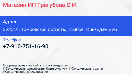 Магазин, ИП Трегубова С.И. по адресу 392014, Тамбовская область, Тамбов, Киквидзе, 69Б в дальнейшем Организация, размещена в следующих категориях: