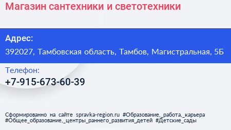 Магазин сантехники и светотехники по адресу 392027, Тамбовская область, Тамбов, Магистральная, 5Б в дальнейшем Организация, размещена в следующих категориях: