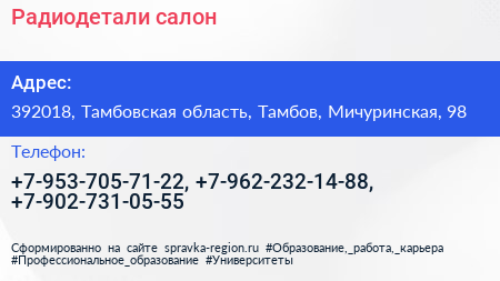 Радиодетали, салон по адресу 392018, Тамбовская область, Тамбов, Мичуринская, 98 в дальнейшем Организация, размещена в следующих категориях: