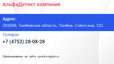 АльфаДетект, компания по адресу 392008, Тамбовская область, Тамбов, Советская, 121 в дальнейшем Организация, размещена в следующих категориях:
