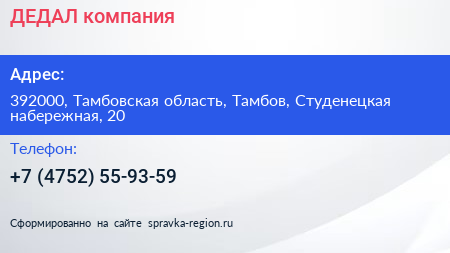 ДЕДАЛ, компания по адресу 392000, Тамбовская область, Тамбов, Студенецкая набережная, 20 в дальнейшем Организация, размещена в следующих категориях: