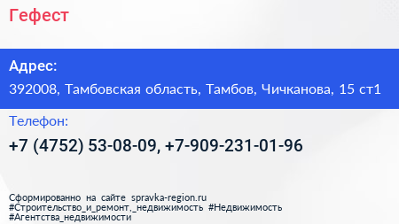 Гефест по адресу 392008, Тамбовская область, Тамбов, Чичканова, 15 ст1 в дальнейшем Организация, размещена в следующих категориях: