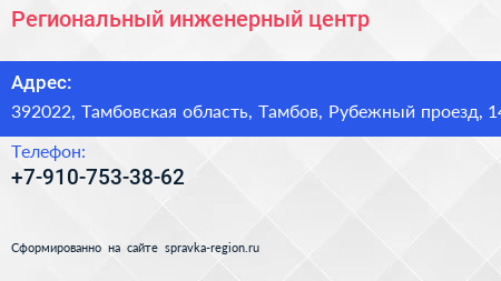 Региональный инженерный центр по адресу 392022, Тамбовская область, Тамбов, Рубежный проезд, 14 в дальнейшем Организация, размещена в следующих категориях: