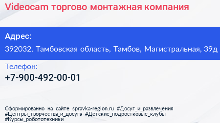 Videocam, торгово-монтажная компания по адресу 392032, Тамбовская область, Тамбов, Магистральная, 39д в дальнейшем Организация, размещена в следующих категориях: