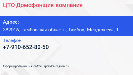 ЦТО Домофонщик, компания по адресу 392016, Тамбовская область, Тамбов, Менделеева, 1 в дальнейшем Организация, размещена в следующих категориях: