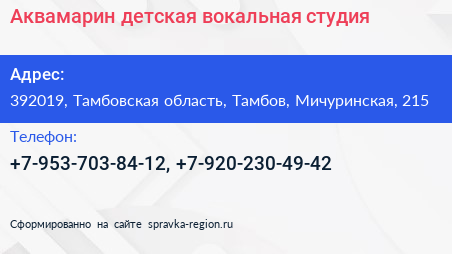 Аквамарин, детская вокальная студия по адресу 392019, Тамбовская область, Тамбов, Мичуринская, 215 в дальнейшем Организация, размещена в следующих категориях: