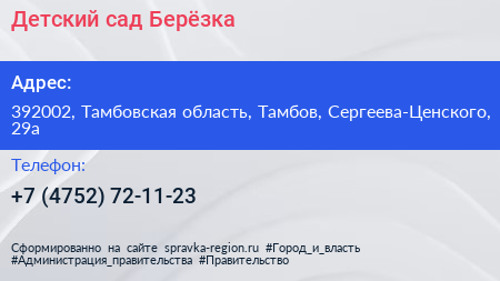 Детский сад Берёзка по адресу 392002, Тамбовская область, Тамбов, Сергеева-Ценского, 29а в дальнейшем Организация, размещена в следующих категориях: