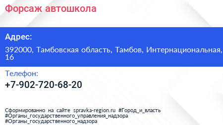 Форсаж, автошкола по адресу 392000, Тамбовская область, Тамбов, Интернациональная, 16 в дальнейшем Организация, размещена в следующих категориях: