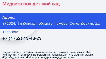 Медвежонок, детский сад по адресу 392024, Тамбовская область, Тамбов, Селезнёвская, 2д в дальнейшем Организация, размещена в следующих категориях:
