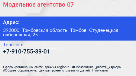 Модельное агентство 07 по адресу 392000, Тамбовская область, Тамбов, Студенецкая набережная, 25 в дальнейшем Организация, размещена в следующих категориях: