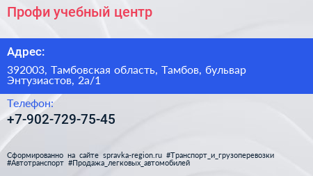 Профи, учебный центр по адресу 392003, Тамбовская область, Тамбов, бульвар Энтузиастов, 2а/1 в дальнейшем Организация, размещена в следующих категориях: