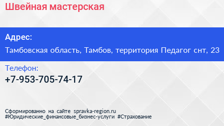 Швейная мастерская по адресу Тамбовская область, Тамбов, территория Педагог снт, 23 в дальнейшем Организация, размещена в следующих категориях: