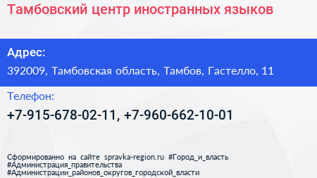 Тамбовский центр иностранных языков по адресу 392009, Тамбовская область, Тамбов, Гастелло, 11 в дальнейшем Организация, размещена в следующих категориях: