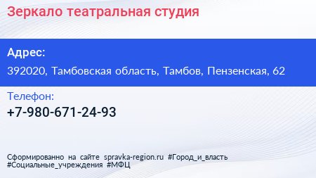 Зеркало, театральная студия по адресу 392020, Тамбовская область, Тамбов, Пензенская, 62 в дальнейшем Организация, размещена в следующих категориях: