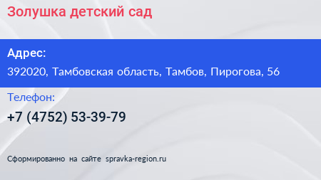 Золушка, детский сад по адресу 392020, Тамбовская область, Тамбов, Пирогова, 56 в дальнейшем Организация, размещена в следующих категориях: