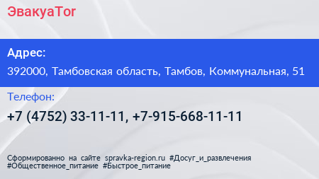 ЭвакуаTor по адресу 392000, Тамбовская область, Тамбов, Коммунальная, 51 в дальнейшем Организация, размещена в следующих категориях:
