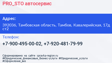 PRO_STO, автосервис по адресу 392036, Тамбовская область, Тамбов, Кавалерийская, 17д ст2 в дальнейшем Организация, размещена в следующих категориях: