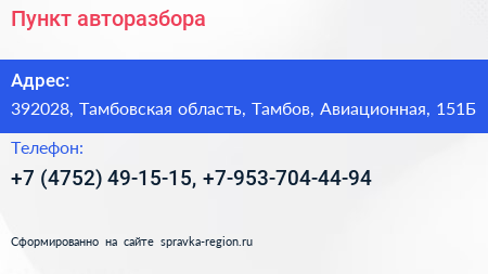 Пункт авторазбора по адресу 392028, Тамбовская область, Тамбов, Авиационная, 151Б в дальнейшем Организация, размещена в следующих категориях: